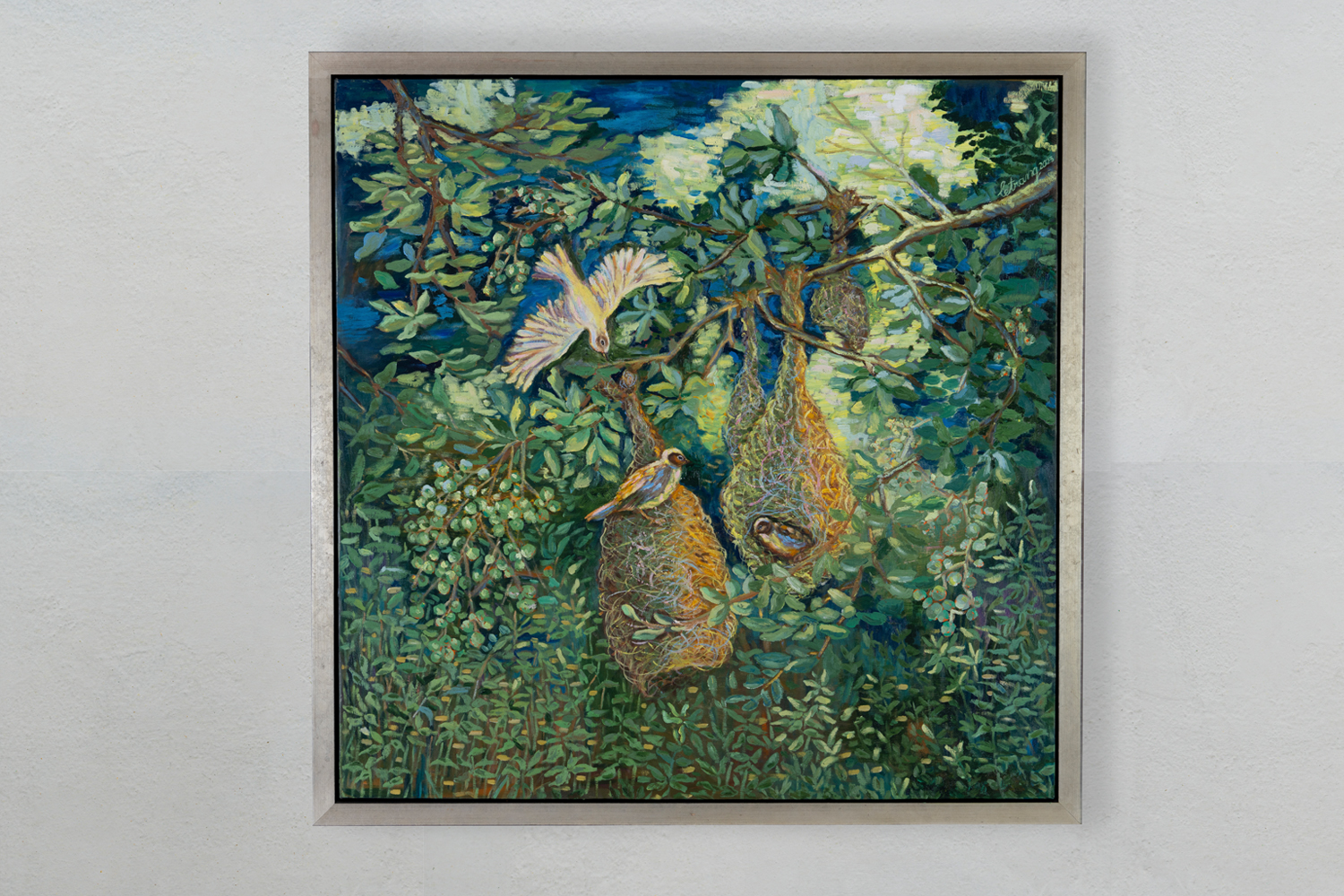 A significant focus of the “Home” series investigates the relationship between nature and memory, drawing inspiration from the artist’s family’s experiences during post-liberation Vietnam in 1975. The portrayal of Asian Golden Weaver birds by Trang serves to evoke memories of the past while highlighting the delicate balance within ecosystems and the intricate connections between nature, kinship, and the human-non-human realm. These birds, native to Southeast Asia, hold cultural significance in the region, symbolizing resilience, adaptability, and environmental harmony