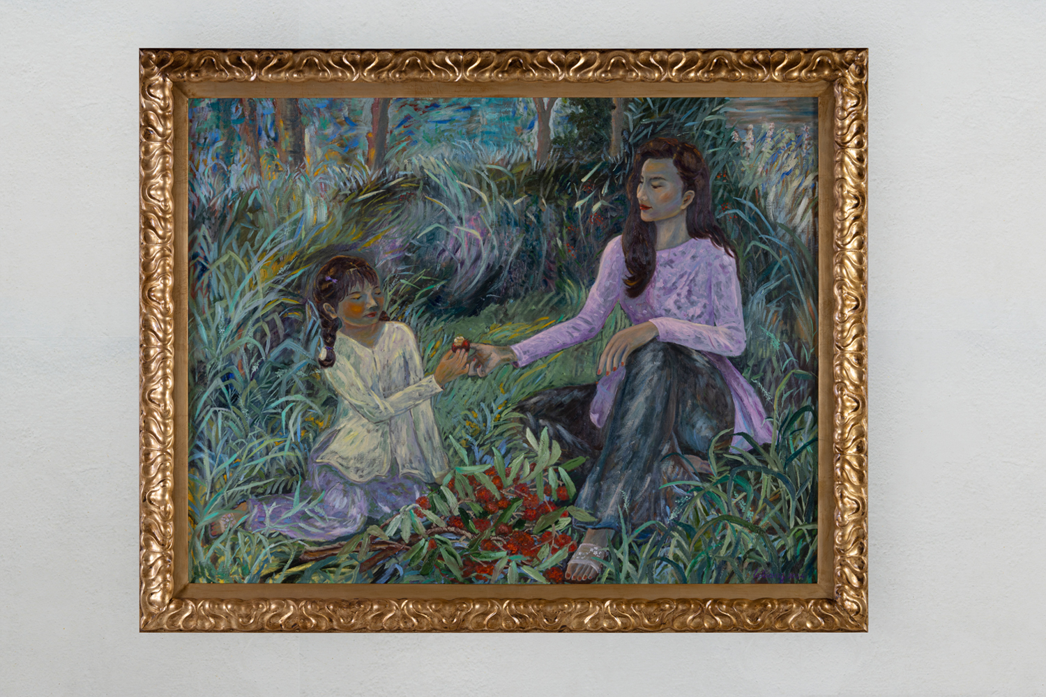 Within her series of paintings exploring the theme of motherhood, Le Trang scrutinises the societal constructs and power dynamics inherent in representations of motherhood. Drawing from feminist discourse, she interrogates traditional narratives surrounding maternity, challenging normative expectations and idealisations. Elucidating the complexities and contradictions embedded within cultural perceptions of motherhood, Trang transcends simplistic dichotomies, presenting motherhood as a site of both empowerment and constraint, where agency and subjugation coalesce in intricate configurations.